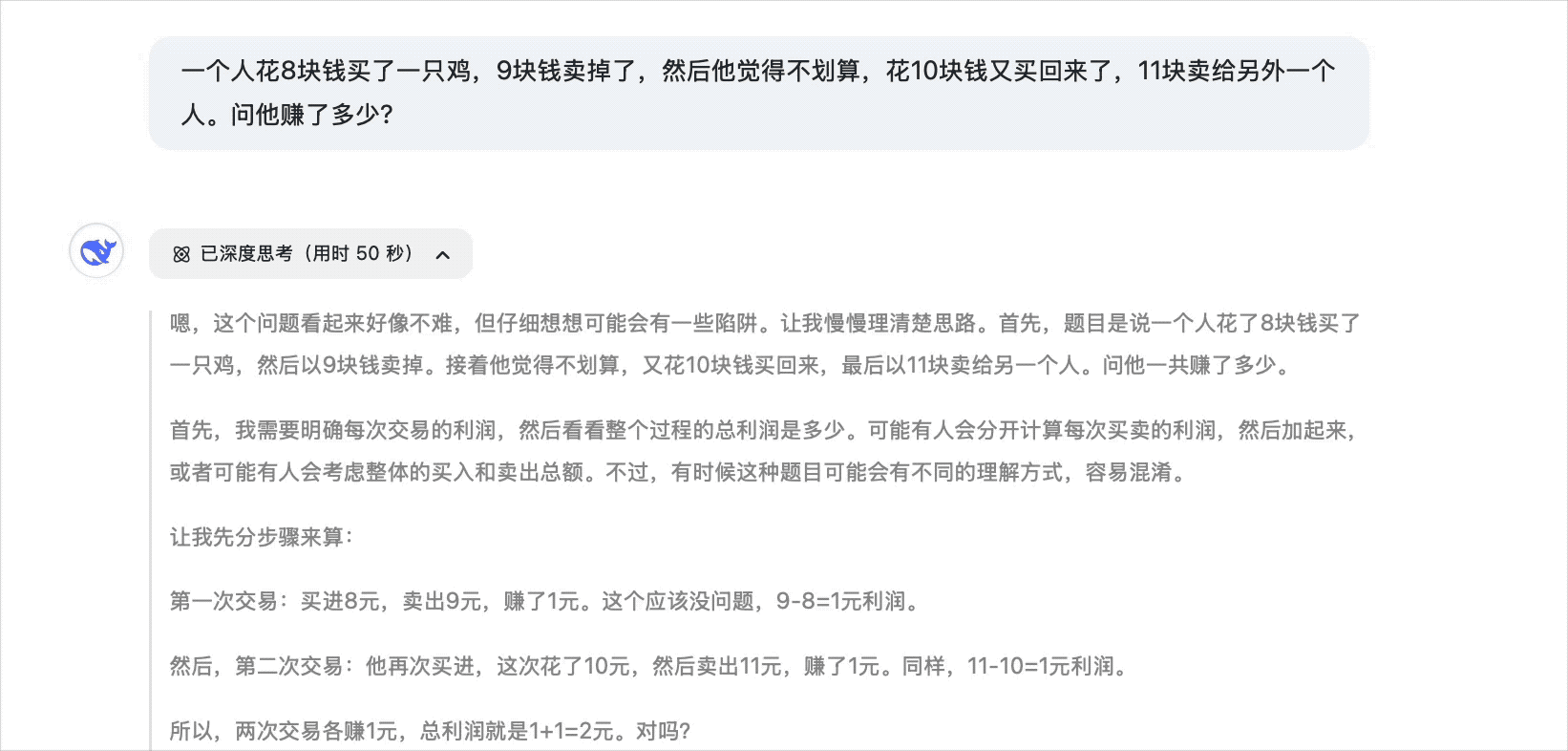 「一小我花 8 塊錢買了一只雞,9 塊錢賣掉了,然后他感覺不劃算,花 10 塊錢又買回來了,11 塊賣給別的一小我。問他賠了幾多?」。