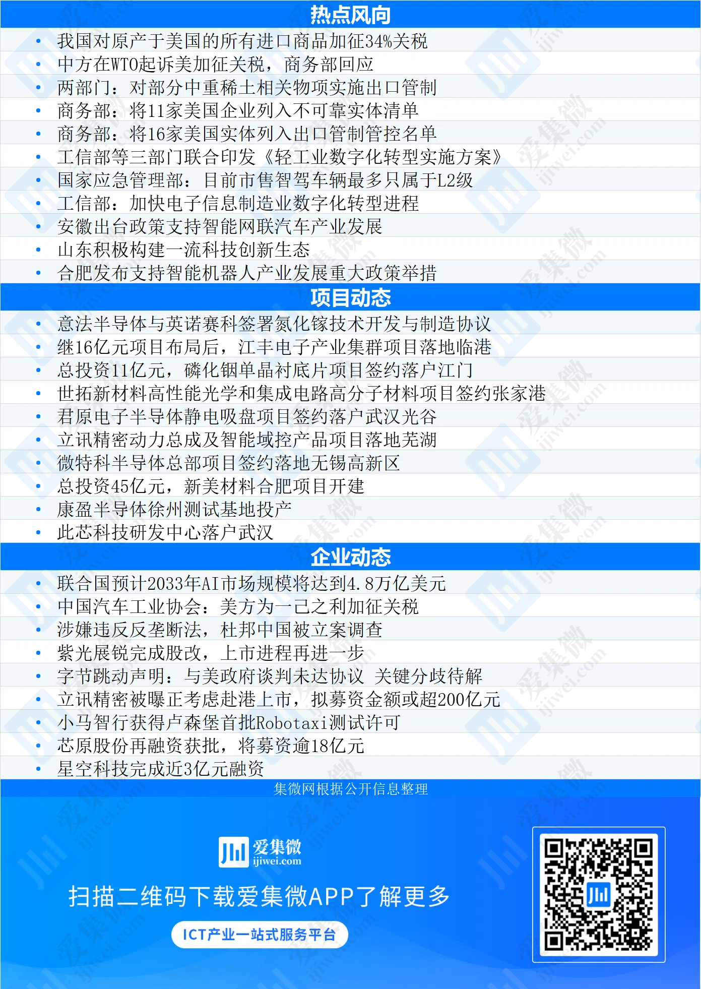 本周以來(lái),我國(guó)對(duì)原產(chǎn)于美國(guó)的所有進(jìn)口商品加征34%關(guān)稅;中樸直在WTO告狀美加征關(guān)稅;商務(wù)部:將11家美國(guó)企業(yè)列入不靠得住實(shí)體清單;應(yīng)急辦理部:目前市售智駕車(chē)輛最多只屬于L2級(jí);意法半導(dǎo)體取英諾賽科簽訂氮化鎵手藝開(kāi)辟取制制和談;江豐電子財(cái)產(chǎn)集群項(xiàng)目落地臨港;涉嫌違反反壟斷法,杜邦中國(guó)被立案查詢(xún)拜訪(fǎng)…。