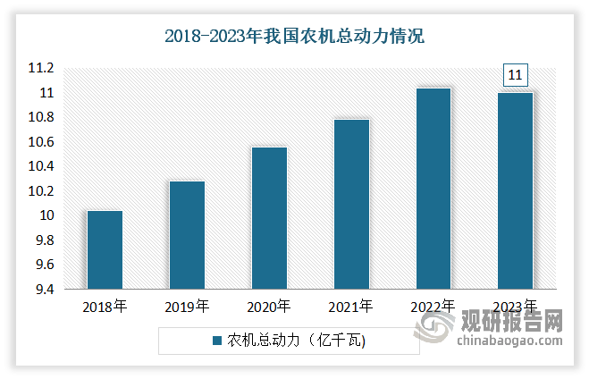 機(jī)械總動力持續(xù)增加。近年我國農(nóng)業(yè)機(jī)械總動力持續(xù)增加,到目前曾經(jīng)成為農(nóng)業(yè)出產(chǎn)中不成或缺的一部門。農(nóng)人也越來越依賴農(nóng)業(yè)機(jī)械進(jìn)行出產(chǎn),對于提超出跨越產(chǎn)效率和降低勞動強(qiáng)度有著主要感化。數(shù)據(jù)顯示,2023年我國農(nóng)機(jī)總動力達(dá)到11億千瓦。