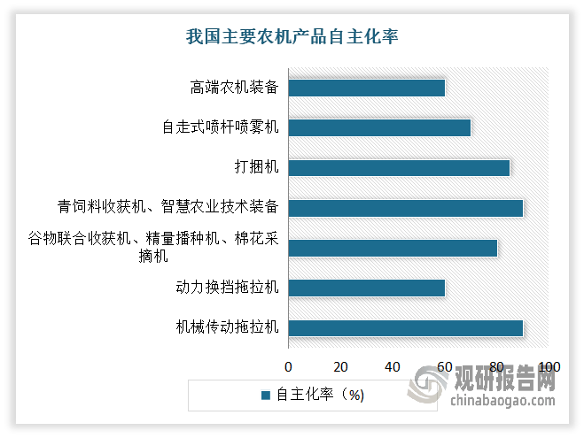 成長到目前我國已成農(nóng)機(jī)制制和利用大國,占領(lǐng)著全球市場27%的份額。2023年我國農(nóng)機(jī)保有量已達(dá)2億臺套,農(nóng)業(yè)分析機(jī)械化率達(dá)到74%。從次要農(nóng)機(jī)產(chǎn)物自從化率來看,到2023年我國機(jī)械傳動拖沓機(jī)已達(dá)90%,動力換擋拖沓機(jī)跨越60%,谷物結(jié)合收成機(jī)、精量播種機(jī)、棉花采摘機(jī)自從化率均達(dá)80%,青飼料收成機(jī)、聰慧農(nóng)業(yè)手藝配備(傳感器、算法模子)達(dá)到90%,打捆機(jī)為85%,自走式噴桿噴霧機(jī)為70%,高端農(nóng)機(jī)配備達(dá)60%。