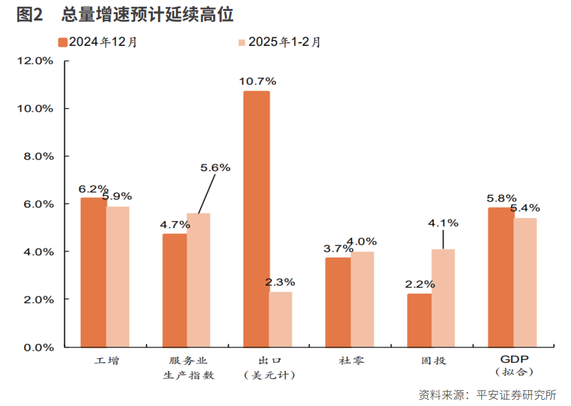 2025年1-2月經(jīng)濟(jì)實(shí)現(xiàn)了優(yōu)良開局,布局上延續(xù)了“供給偏強(qiáng)、需求偏弱”的趨向。以全年經(jīng)濟(jì)成長(zhǎng)方針5%為基準(zhǔn)來看,供給側(cè)工業(yè)添加值增速達(dá)5。9%,高于現(xiàn)實(shí)P方針增速,而需求側(cè)的社零、出口和投資增速均低于5%。