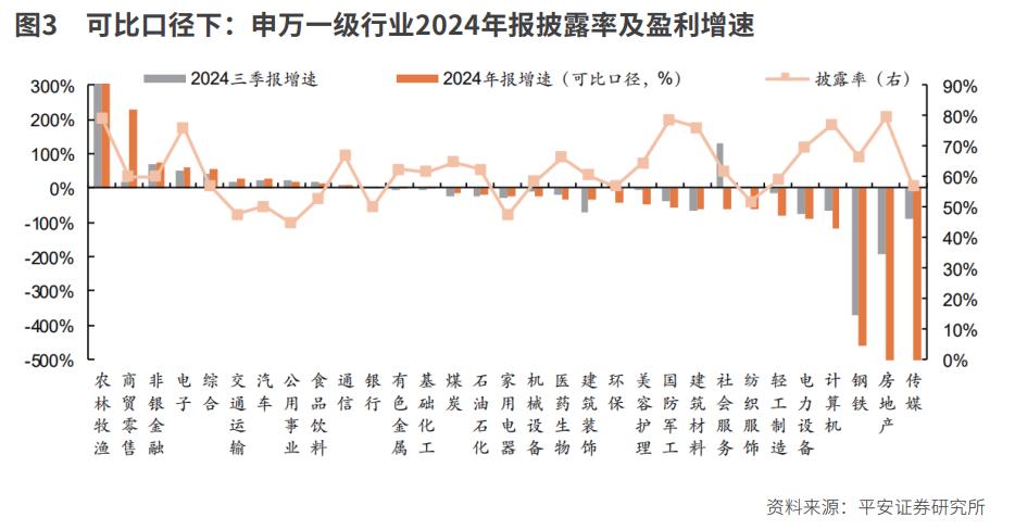 從行業(yè)來看,申萬(wàn)31個(gè)一級(jí)行業(yè)中,13個(gè)盈利實(shí)現(xiàn)正增。農(nóng)林牧漁、商貿(mào)零售、非銀金融、電子、分析、交運(yùn)、汽車行業(yè)2024年報(bào)累計(jì)盈利增速正在20%-540%之間,并較2024年三季報(bào)邊際改善;其次是公用事業(yè)、食物飲料、通信、銀行,盈利增速正在4%-23%之間。上逛周期中,有色、化工、煤炭、石油石化的業(yè)績(jī)?cè)鏊龠呺H改善、但鋼鐵、建材承壓;中逛制制全體業(yè)績(jī)?nèi)杂袎毫?,機(jī)械設(shè)備、國(guó)防軍工、電力設(shè)備盈利降幅擴(kuò)大;下逛消費(fèi)的景氣集中正在公共消費(fèi)和以舊換新,商貿(mào)零售、汽車、食物飲料盈利增速相對(duì)韌性,家電、美容護(hù)理、社服、醫(yī)藥的業(yè)績(jī)相對(duì)承壓;TMT板塊表示分化,受益于AI算力需求,電子和通信盈利增速居前,計(jì)較機(jī)和傳媒仍正在承壓。