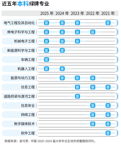 6月11日,2025年版就業(yè)藍(lán)皮書(包羅《2025年中國(guó)本科生就業(yè)演講》《2025年中國(guó)高職生就業(yè)演講》)正式發(fā)布,2025年綠牌專業(yè)揭曉。就業(yè)藍(lán)皮書的專業(yè)預(yù)警部門,基于各專業(yè)結(jié)業(yè)生的就業(yè)落實(shí)環(huán)境、薪資程度和就業(yè)對(duì)勁度,連系國(guó)度計(jì)謀和沉點(diǎn)成長(zhǎng)范疇對(duì)人才的需求,以及專業(yè)布點(diǎn)的動(dòng)態(tài)調(diào)整,分析定位出了“紅黃綠牌”專業(yè)。此中的“綠牌專業(yè)”是指就業(yè)落實(shí)率、薪資和就業(yè)對(duì)勁度分析較高,且市場(chǎng)需求增加的專業(yè),可謂就業(yè)市場(chǎng)的“績(jī)優(yōu)股”。2025年本科綠牌專業(yè)包羅:電氣工程及其從動(dòng)化、微電子科學(xué)取工程、機(jī)械電子工程、新能源科學(xué)取工程、車輛工程、機(jī)械人工程,均為工科專業(yè)。此中,微電子科學(xué)取工程專業(yè)結(jié)業(yè)后次要處置集成電工程手藝人員,新能源科學(xué)取工程專業(yè)結(jié)業(yè)生次要成為電廠操做人員,機(jī)械人工程專業(yè)結(jié)業(yè)生則次要處置機(jī)械人工程手藝人員工做。這些專業(yè)的人才培育取芯片、碳中和、智能制制等國(guó)度計(jì)謀急需范疇親近相關(guān),是當(dāng)前政策沉點(diǎn)攙扶范疇,科研經(jīng)費(fèi)和財(cái)產(chǎn)投資稠密。電氣工程及其從動(dòng)化、車輛工程屬于保守行業(yè)升級(jí)標(biāo)的目的,因而展示出較好的成長(zhǎng)前景。從近五年本科綠牌專業(yè)榜單來看,電氣工程及其從動(dòng)化、微電子科學(xué)取工程均上榜4次;機(jī)械電子工程、能源取動(dòng)力工程、消息工程均上榜3次;車輛工程為初次上榜。鮮少有專業(yè)可以或許持續(xù)穩(wěn)居綠牌專業(yè)榜單。統(tǒng)不雅近年來本科綠牌專業(yè)榜單變化能夠看出,能源動(dòng)力類、電子消息類專業(yè)強(qiáng)勢(shì)霸榜,展示出較大的成長(zhǎng)潛力。這些專業(yè)兼具計(jì)謀必需性、手藝不成替代性取市場(chǎng)強(qiáng)需求性,正在政策、財(cái)產(chǎn)、手藝三沉盈利疊加下,構(gòu)成“需求剛性高—供給稀缺性強(qiáng)—就業(yè)持續(xù)性長(zhǎng)”的正向輪回。這些綠牌專業(yè)正在就業(yè)市場(chǎng)中展示出強(qiáng)勁的合作力,其就業(yè)質(zhì)量更以“高薪資、強(qiáng)婚配、具體數(shù)據(jù)更能曲不雅印證這一劣勢(shì)——2025年的本科綠牌專業(yè)均為本科生結(jié)業(yè)半年后平均月收入排前40位的專業(yè)。此中,2024屆微電子科學(xué)取工程專業(yè)的平均月收入高達(dá)7282元,位列本科高薪專業(yè)的第2位;2024屆機(jī)械電子工程專業(yè)的平均月收入為7018元,位列本科高薪專業(yè)的第10位;2024屆電氣工程及其從動(dòng)化的工做取專業(yè)相關(guān)度、就業(yè)對(duì)勁度別離為86%、85%,排正在本科次要專業(yè)前列(工做取專業(yè)相關(guān)度:第15位,就業(yè)對(duì)勁度:第8位)。別的值得留意的是,曾正在過去多年一度霸榜的計(jì)較機(jī)類專業(yè),如消息平安、收集工程、軟件工程,近三年來均未進(jìn)入綠牌專業(yè)榜單,顯示了財(cái)產(chǎn)更迭布景下的專業(yè)成長(zhǎng)動(dòng)向,但其就業(yè)仍然存正在較著劣勢(shì)。2025年高職綠牌專業(yè)包羅:鐵道機(jī)車使用取、電氣從動(dòng)化手藝、使用化工手藝、工業(yè)機(jī)械人手藝、新能源汽車手藝、智能節(jié)制手藝,多為配備制制大類專業(yè)。此中,鐵道機(jī)車使用取專業(yè)結(jié)業(yè)生次要處置的是列車司機(jī)、機(jī)車檢修操做人員工做,工業(yè)機(jī)械人手藝專業(yè)結(jié)業(yè)生次要成為工業(yè)機(jī)械人系統(tǒng)操做人員等,從其職業(yè)流向能夠看出,這些高職綠牌專業(yè),慎密環(huán)繞國(guó)度計(jì)謀取財(cái)產(chǎn)升級(jí)需求,構(gòu)成了對(duì)先輩制制業(yè)、現(xiàn)代交通系統(tǒng)及綠色經(jīng)濟(jì)的全方位支持。從近五年高職綠牌專業(yè)榜單來看,鐵道機(jī)車上榜4次;使用化工手藝、道橋梁工程手藝、鐵道工程手藝均上榜3次;工業(yè)機(jī)械人手藝、鐵道機(jī)車使用取均為初次上榜。統(tǒng)不雅近年來高職綠牌專業(yè)榜單變化能夠看出,相關(guān)專業(yè)的人才培育慎密對(duì)接“交通強(qiáng)國(guó)”“智能制制”“新能源”等國(guó)度計(jì)謀標(biāo)的目的。當(dāng)前,我國(guó)正處于財(cái)產(chǎn)升級(jí)取科技立異的環(huán)節(jié)階段,國(guó)度計(jì)謀結(jié)構(gòu)深刻影響著各行業(yè)的成長(zhǎng)標(biāo)的目的。高職院校的工科專業(yè)做為技術(shù)型人才培育的從陣地,其專業(yè)定位取行業(yè)需求慎密聯(lián)系關(guān)系。如正在先輩制制業(yè)集群中,工業(yè)機(jī)械人手藝專業(yè)成為智能制制車間數(shù)字化轉(zhuǎn)型的環(huán)節(jié)抓手;正在交通強(qiáng)國(guó)計(jì)謀驅(qū)動(dòng)下,鐵道機(jī)車使用取專業(yè)聚焦軌道交通配備的運(yùn)維改革,新能源汽車手藝加快鞭策汽車財(cái)產(chǎn)電動(dòng)化轉(zhuǎn)型歷程;面向綠色經(jīng)濟(jì)轉(zhuǎn)型,使用化工手藝專業(yè)通過優(yōu)化出產(chǎn)工藝實(shí)現(xiàn)化工范疇的節(jié)能減排,為碳中和實(shí)現(xiàn)和可持續(xù)成長(zhǎng)貢獻(xiàn)力量。從