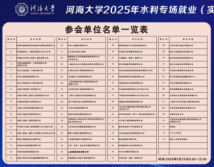 從河海大學2025年水利專場就業(yè)會上能夠看到參會單元中,中國電建、中國建建、中國電子、中鐵大橋、中交三局……這些“中字頭”的企業(yè)占領了“半壁山河”。